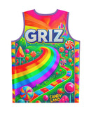 The jersey features a kaleidoscope of candy-inspired colors, from bright pinks and blues to lush greens and purples, creating a visually stunning experience. The front showcases GRIZ's iconic logo, seamlessly integrated into the candy landscape, while the back features bold, colorful numbers with a candy-coated finish.
