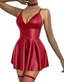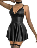 Rave Leather Collar Plunge Mini Skirt Choker Stocking EDM Set Dress with Thong 3 Piece