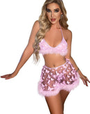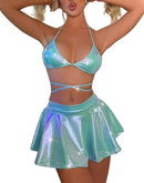 Rave Women's Shiny Rave Outfits Holographic Halter Bra Top Mini Skirt 2Pcs Glitter Sequin Music Festival Party Clubwear